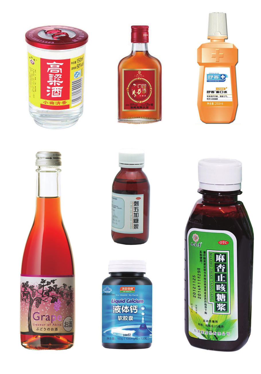 糖漿、保健品、酒、消毒液、漱口水等大劑量溶液的自動理瓶、灌裝、旋蓋、貼標生產(chǎn)線